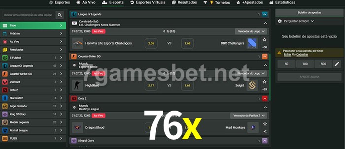 O 76x oferece uma grande seleção de opções de apostas em e-sports com probabilidades competitivas